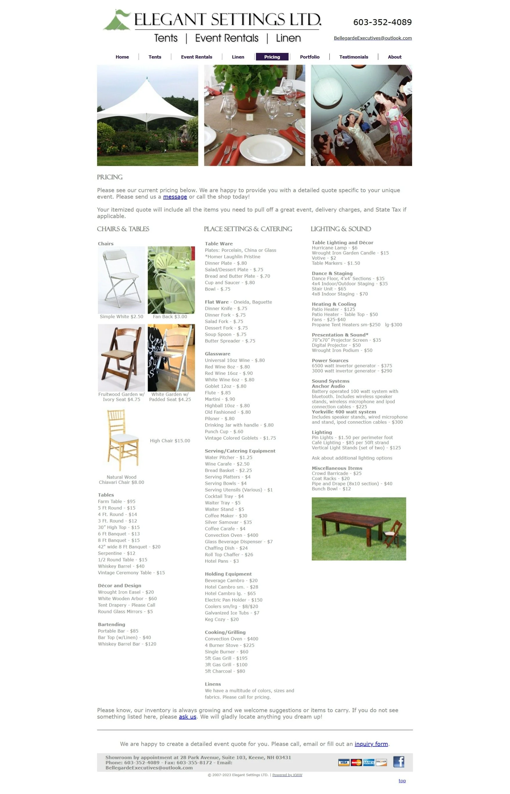 Best company in Keene for renting all shapes and sizes of tents, dishes, big clean grills, beautiful bright lights, multiple types of chairs and tables, and a colorful variety of linens. They do a variety of different types of functions from weddings, music festivals, corporate outings, and etc.”
